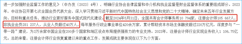 時隔三年,中國注冊會計師協(xié)會在2024年9月24日發(fā)布了《慶祝中華人民共和國成立75周年注冊會計師行業(yè)工作與發(fā)展成就掠影》,提到截至2024年5月31日,全國共有?注冊會計師105667人。??全國共有?會計師事務(wù)所10794家,?非執(zhí)業(yè)會員281237人,從業(yè)人員超過40萬人,2023年行業(yè)實現(xiàn)?業(yè)務(wù)收入1106.75億元。
