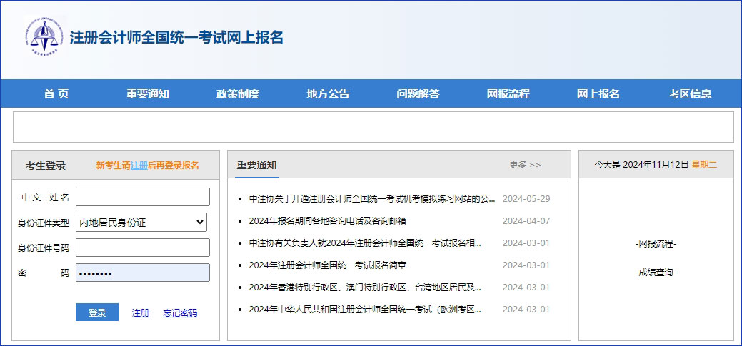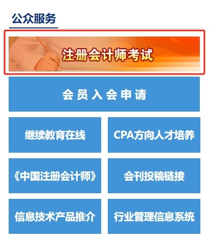 第1步:訪問中國注冊會計師協會官方網站(https://www.cicpa.org.cn/),找到“公共服務”板塊,點擊“注冊會計師考試”。