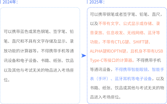 上文對變化部分進(jìn)行了高亮顯示,“橙色部分”為計算器規(guī)格的變化,“藍(lán)色部分”為對不可攜帶物品的補充要求。