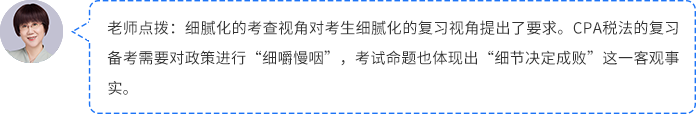 近些年來,CPA稅法考試所考核的客觀題需要主觀化計算的點較少,提問往往單刀直入,但是考查的知識點廣且細,在細微之處洞悉考生學習的全面細致程度。主觀題的命題則加大了問答的分值比重,計算問答題的提問中有 30% 左右的問題需要文字回答政策或分析,綜合題中也出現(xiàn)了要求文字作答的問題。
