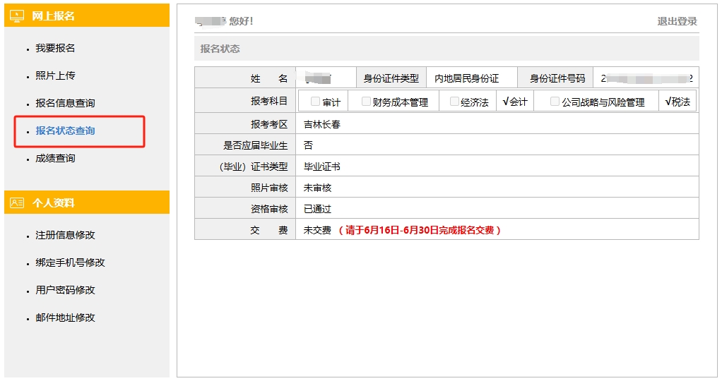 如果照片審核狀態(tài)和資格審核狀態(tài)均顯示“已通過(guò)”,交費(fèi)狀態(tài)顯示“未交費(fèi)”,則基本上可以初步判斷報(bào)名成功。