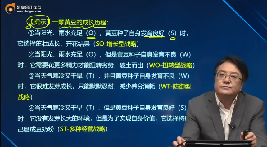 例如在SWOT理論的講解中,田明老師為讓學(xué)員掌握記憶四種戰(zhàn)略形式,就用黃豆種子的發(fā)育情況,進(jìn)行排列組合舉例,清晰闡述增長型戰(zhàn)略(SO)、扭轉(zhuǎn)型戰(zhàn)略(WO)、防御型戰(zhàn)略(WT)和多種經(jīng)營戰(zhàn)略(ST),很多學(xué)員表示,這個難記憶的知識點,但聽完田明老師的舉例,馬上就掌握了要點,扎實記憶。