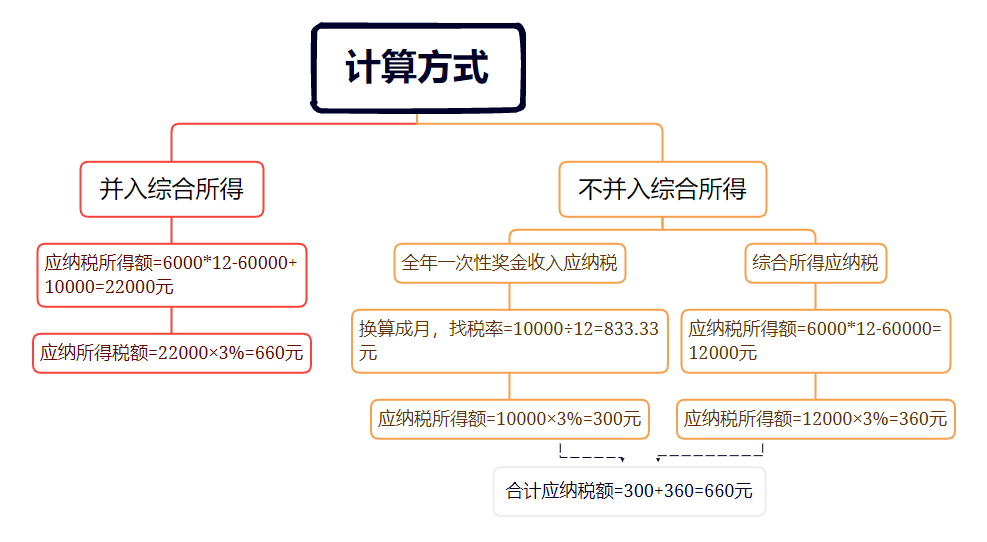 對于工資和獎金收入都不高的員工A來說,并入綜合所得和不并入綜合所得單獨(dú)計(jì)稅沒有區(qū)別,兩種計(jì)算方式最終的結(jié)果是一樣的。
