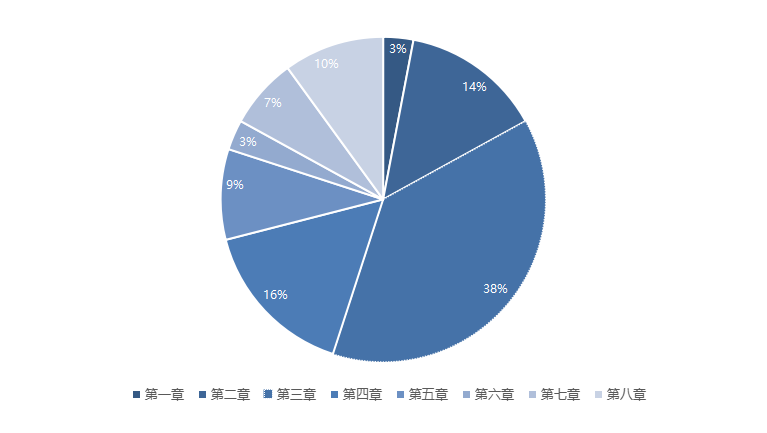 由上圖可知,第三章的知識點(diǎn)仍然是重頭戲,屬于“第一梯隊(duì)”;第二、四、七、八的分值比較穩(wěn)定,與去年相比差別不大,屬于“第二梯隊(duì)”;其他章節(jié)的分值相差不多,仍屬于“第三梯隊(duì)”。