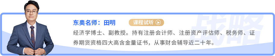 這里不得不提到東奧田明老師,他是經(jīng)濟(jì)學(xué)博士、副教授,持有注冊會計(jì)師、注冊資產(chǎn)評估師、稅務(wù)師、證券期貨資格四大高含金量證書。田明老師執(zhí)教多年,對注會《戰(zhàn)略》科目每一章節(jié)內(nèi)容如數(shù)家珍,有著自己的一套教學(xué)模式。