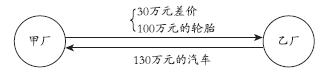 解題方向:印花稅一般是雙邊征收,所以要看清題目問題。本題問“甲”應(yīng)繳納的印花稅,對(duì)于甲而言,“賣”輪胎、“買”汽車,賣價(jià)100萬元、買價(jià)130萬元。所以印花稅的計(jì)稅依據(jù)是230萬元。
