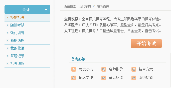 東奧機(jī)考模擬系統(tǒng)分為十個模塊。其中核心題庫主要分為強(qiáng)化訓(xùn)練、隨機(jī)考試和模擬機(jī)考三部分,這樣設(shè)置的目的也是為了適應(yīng)學(xué)員循序漸進(jìn)的學(xué)習(xí)習(xí)慣(基礎(chǔ)練習(xí)——綜合提高——沖刺演練),同時也包括了“我的錯題”、“我的收藏”、“答題記錄”、“機(jī)考課程”等很多其他的功能模塊,下面為大家詳細(xì)介紹東奧機(jī)考模擬系統(tǒng)的主要模塊: