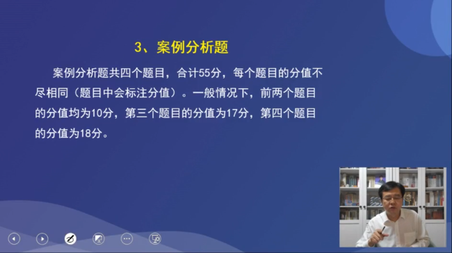 案例分析題共四個(gè)題目,合計(jì)55分,每個(gè)題目的分值不盡相同(題目中會標(biāo)注分值)。一般情況下,前兩個(gè)題目的分值均為10分,第三個(gè)題目的分值為17分,第四個(gè)題目的分值為18分。
