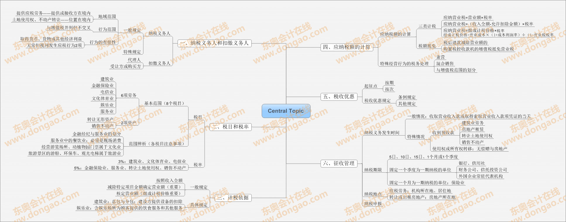 【東奧小編】2014年注冊(cè)會(huì)計(jì)師考試正式進(jìn)入基礎(chǔ)備考階段,注會(huì)知識(shí)點(diǎn)繁雜細(xì)碎,想要全面掌握注會(huì)各科目的知識(shí),需要科學(xué)高效的學(xué)習(xí)方法,思維導(dǎo)圖正是一種非常適合注會(huì)復(fù)習(xí)的學(xué)習(xí)方法,正確利用思維導(dǎo)圖,不僅能使自己積極進(jìn)行知識(shí)點(diǎn)總結(jié),形成清晰的思路,還能對(duì)知識(shí)點(diǎn)進(jìn)行快速查漏補(bǔ)缺。以下是2014《稅法》第四章?tīng)I(yíng)業(yè)稅思維導(dǎo)圖: