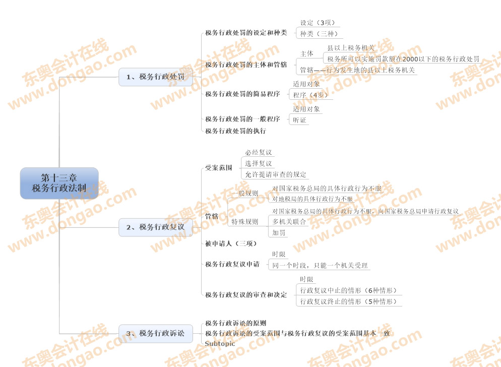 【東奧小編】2014年注冊(cè)會(huì)計(jì)師考試正式進(jìn)入基礎(chǔ)備考階段,注會(huì)知識(shí)點(diǎn)繁雜細(xì)碎,想要全面掌握注會(huì)各科目的知識(shí),需要科學(xué)高效的學(xué)習(xí)方法,思維導(dǎo)圖正是一種非常適合注會(huì)復(fù)習(xí)的學(xué)習(xí)方法,正確利用思維導(dǎo)圖,不僅能使自己積極進(jìn)行知識(shí)點(diǎn)總結(jié),形成清晰的思路,還能對(duì)知識(shí)點(diǎn)進(jìn)行快速查漏補(bǔ)缺。以下是2014《稅法》第十三章稅務(wù)行政法制思維導(dǎo)圖: