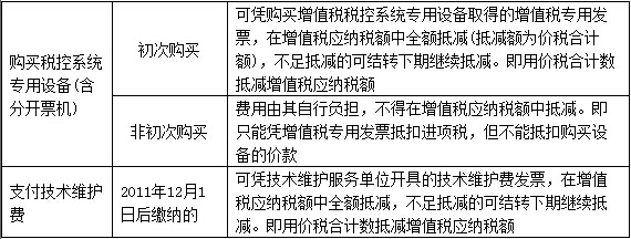 增值稅納稅人2011年12月1日(含,下同)以后初次購(gòu)買(mǎi)增值稅稅控系統(tǒng)專(zhuān)用設(shè)備(包括分開(kāi)票機(jī))支付的費(fèi)用以及繳納的技術(shù)維護(hù)費(fèi),可在增值稅應(yīng)納稅額中全額抵減。具體規(guī)定如下表: