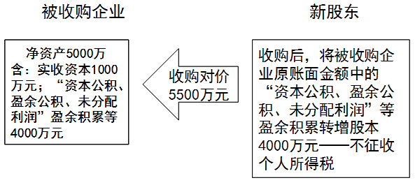 (1)新股東以不低于凈資產(chǎn)價(jià)格收購股權(quán)的,企業(yè)原盈余積累已全部計(jì)入股權(quán)交易價(jià)格,新股東取得盈余積累轉(zhuǎn)增股本的部分,不征收個(gè)人所得稅。