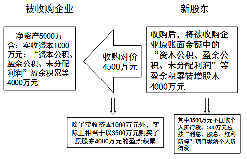 1名或多名個(gè)人投資者以股權(quán)收購方式取得被收購企業(yè)股權(quán),股權(quán)收購前,被收購企業(yè)原賬面金額中的“資本公積、盈余公積、未分配利潤”等盈余積累未轉(zhuǎn)增股本,而在股權(quán)交易時(shí)將其一并計(jì)入股權(quán)轉(zhuǎn)讓價(jià)格并履行了所得稅納稅義務(wù)。股權(quán)收購后,企業(yè)將原賬面金額中的盈余積累向個(gè)人投資者(新股東,下同)轉(zhuǎn)增股本,有關(guān)個(gè)人所得稅問題區(qū)分以下情形處理: