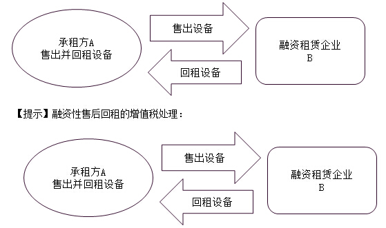 (1)融資性售后回租。是指承租方以融資為目的,將資產(chǎn)出售給從事融資租賃業(yè)務(wù)的企業(yè)后,又將該資產(chǎn)租回的業(yè)務(wù)活動(dòng)。承租方先將資產(chǎn)銷(xiāo)售取得資金,再支付資金將已售資產(chǎn)租回使用,其實(shí)質(zhì)屬于融資行為。