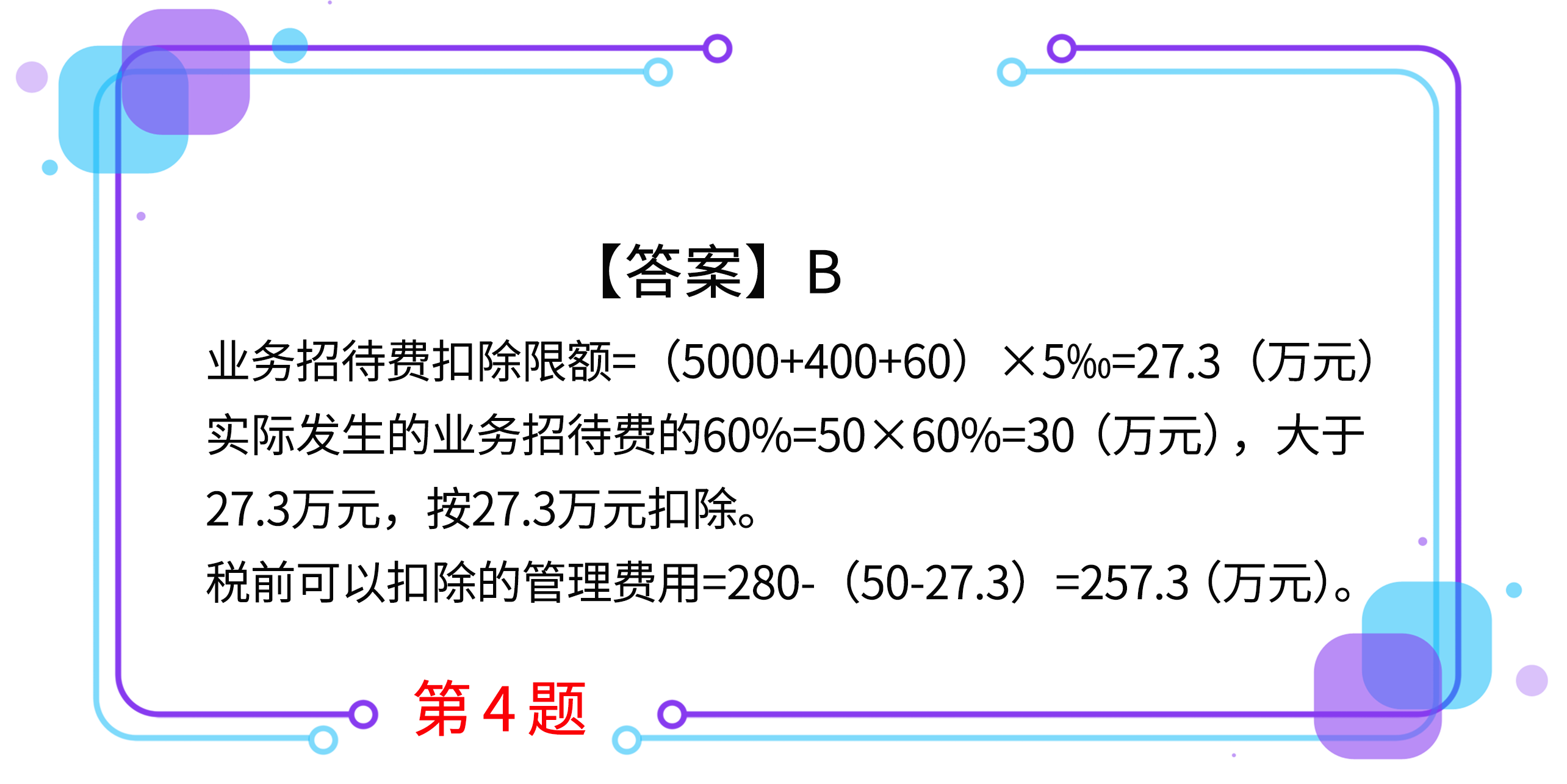 4.某居民企業(yè)2019年度取得產(chǎn)品銷售收入5000萬元,銷售不需要的材料取得收入400萬元,分回的投資收益761萬元,出租房屋取得租金收入60萬元,發(fā)生管理費用280萬元,包括業(yè)務(wù)招待費50萬元。該企業(yè)2019年度所得稅前可以扣除管理費用( )萬元。