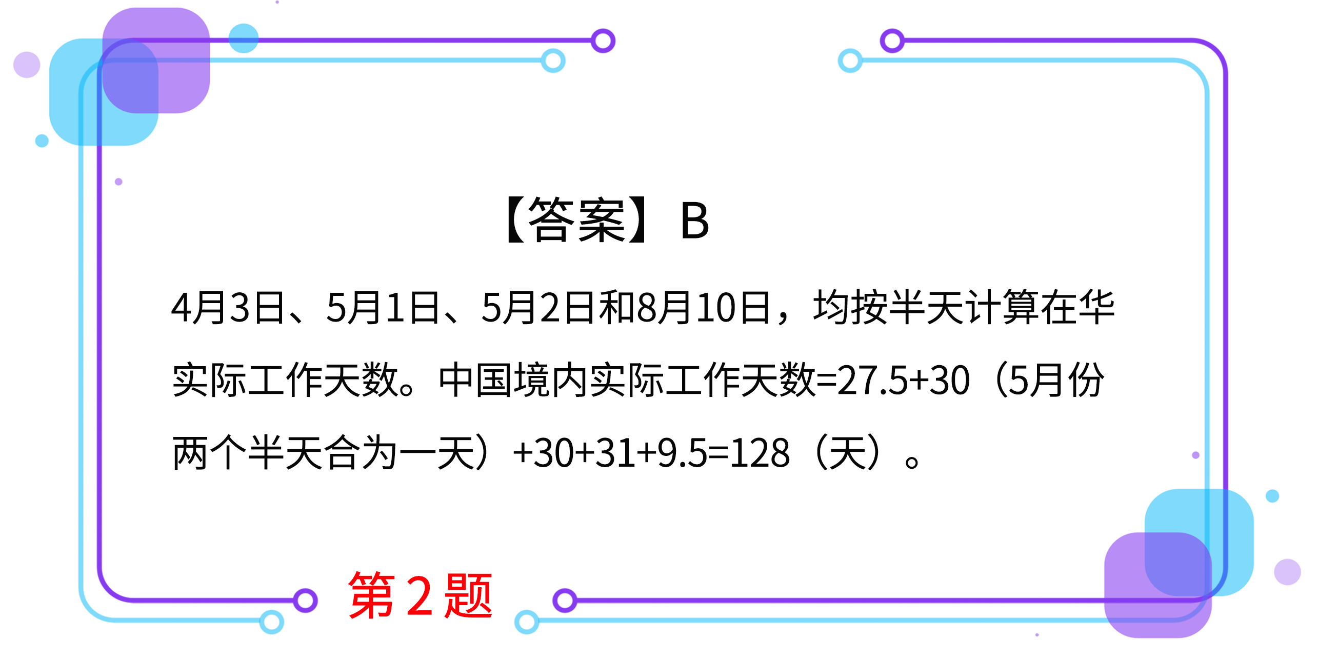 2.約翰為外籍個(gè)人,在中國境內(nèi)無住所,同時(shí)在中國境內(nèi)W公司擔(dān)任高管,2019年4月3日來華,8月10日離開。期間約翰因工作原因,曾于5月1日離境,5月2日返回。在計(jì)算個(gè)人所得稅時(shí),他在中國境內(nèi)實(shí)際工作天數(shù)為( )天。