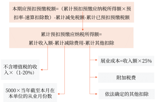 本期應(yīng)預(yù)扣預(yù)繳稅額=(累計預(yù)扣預(yù)繳應(yīng)納稅所得額×預(yù)扣率-速算扣除數(shù))-累計減免稅額-累計已預(yù)扣預(yù)繳稅額