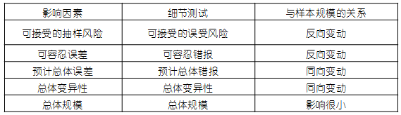 注冊會計師在細節(jié)測試中確定的樣本規(guī)模受到以下因素的影響,如下表: