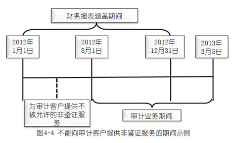 2.如果在財(cái)務(wù)報(bào)表涵蓋的期間之后,在審計(jì)項(xiàng)目組開始執(zhí)行審計(jì)業(yè)務(wù)之前,會(huì)計(jì)師事務(wù)所向?qū)徲?jì)客戶提供了非鑒證服務(wù),并且該非鑒證服務(wù)在審計(jì)期間不允許提供,會(huì)計(jì)師事務(wù)所應(yīng)當(dāng)評(píng)價(jià)提供的非鑒證服務(wù)對(duì)獨(dú)立性產(chǎn)生的不利影響。