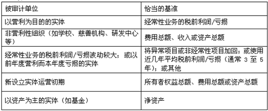 適當(dāng)?shù)幕鶞嗜Q于被審計單位的具體情況,下表列示了不同性質(zhì)的被審計單位及其恰當(dāng)?shù)幕鶞剩?/P>