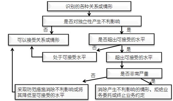 第三,必要時采取防范措施消除不利影響或?qū)⑵浣档椭量山邮艿乃健?/P>