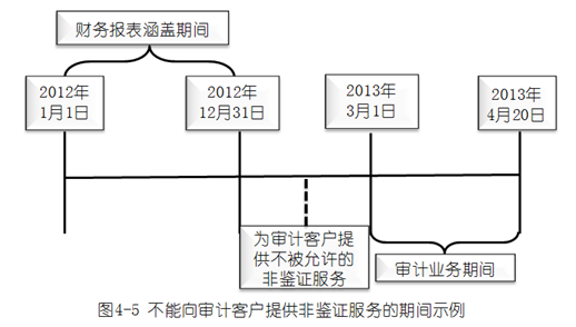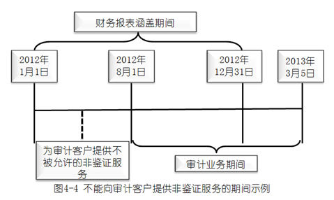 2.如果在財(cái)務(wù)報(bào)表涵蓋的期間之后,在審計(jì)項(xiàng)目組開始執(zhí)行審計(jì)業(yè)務(wù)之前,會(huì)計(jì)師事務(wù)所向?qū)徲?jì)客戶提供了非鑒證服務(wù),并且該非鑒證服務(wù)在審計(jì)期間不允許提供,會(huì)計(jì)師事務(wù)所應(yīng)當(dāng)評(píng)價(jià)提供的非鑒證服務(wù)對(duì)獨(dú)立性產(chǎn)生的不利影響。