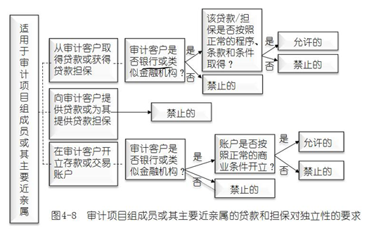 依據(jù)圖4-8,針對(duì)審計(jì)項(xiàng)目組成員或其主要近親屬的貸款和擔(dān)保業(yè)務(wù),分析如下: