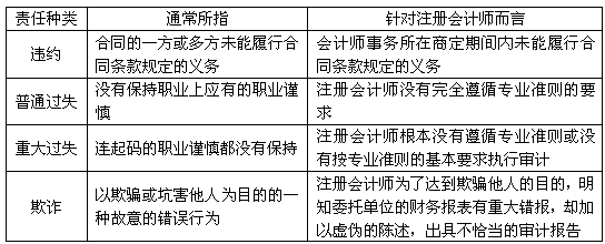 對(duì)注冊(cè)會(huì)計(jì)師法律責(zé)任可能被認(rèn)定為違約、過(guò)失和欺詐,其中,過(guò)失可按程度不同區(qū)分為普通過(guò)失和重大過(guò)失。如下表所示: