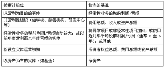 適當(dāng)?shù)幕鶞?zhǔn)取決于被審計(jì)單位的具體情況,下表列示了不同性質(zhì)的被審計(jì)單位及其恰當(dāng)?shù)幕鶞?zhǔn):