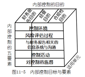 【相關(guān)說(shuō)明1】根據(jù)審計(jì)準(zhǔn)則對(duì)內(nèi)部控制的定義,內(nèi)部控制的目標(biāo)和要素如圖11-5所示: