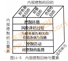 【相關(guān)說明1】根據(jù)審計(jì)準(zhǔn)則對內(nèi)部控制的定義,內(nèi)部控制的目標(biāo)和要素如圖11-5所示: