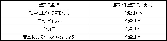 為選定的基準(zhǔn)確定百分比需要運(yùn)用職業(yè)判斷。百分比和選定的基準(zhǔn)之間存在一定的聯(lián)系,如經(jīng)常性業(yè)務(wù)的稅前利潤對應(yīng)的百分比通常比營業(yè)收入對應(yīng)的百分比要高。