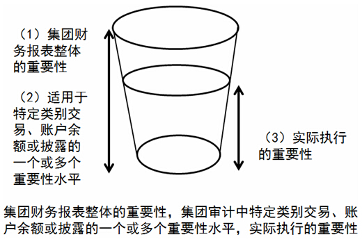 【知識點拓展】在集團財務報表審計中,注冊會計師在計劃集團審計工作時應當確定基于“集團財務報表整體的重要性”,如“杯子”的左側(cè)(1)所示: