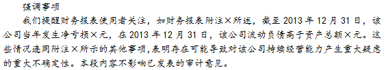 如果財(cái)務(wù)報(bào)表已作出充分披露,注冊(cè)會(huì)計(jì)師應(yīng)當(dāng)發(fā)表無保留意見,并在審計(jì)報(bào)告中增加強(qiáng)調(diào)事項(xiàng)段,強(qiáng)調(diào)可能導(dǎo)致對(duì)持續(xù)經(jīng)營能力產(chǎn)生重大疑慮的事項(xiàng)或情況存在重大不確定性的事實(shí),提醒財(cái)務(wù)報(bào)表使用者關(guān)注財(cái)務(wù)報(bào)表附注中對(duì)有關(guān)事項(xiàng)的披露。