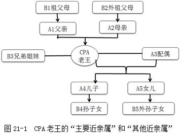 下面我們以ABC會(huì)計(jì)師事務(wù)所審計(jì)項(xiàng)目組成員CPA“老王”為例,結(jié)合注冊(cè)會(huì)計(jì)師實(shí)務(wù)操作,把CPA“老王”的“近親屬”分為主要近親屬(用A表示)和其他近親屬(用B表示),如圖21-1所示: