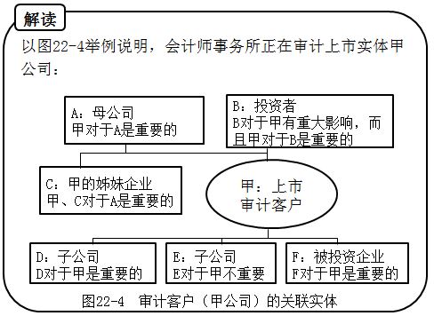 母公司是指直接或間接控制被審計(jì)單位的實(shí)體,且當(dāng)被審計(jì)單位對其重要時,該母公司應(yīng)當(dāng)被包含在審計(jì)客戶的定義中,即圖22-4中的A公司。