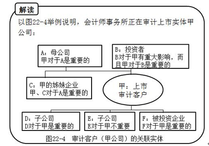母公司是指直接或間接控制被審計(jì)單位的實(shí)體,且當(dāng)被審計(jì)單位對(duì)其重要時(shí),該母公司應(yīng)當(dāng)被包含在審計(jì)客戶(hù)的定義中,即圖22-4中的A公司。