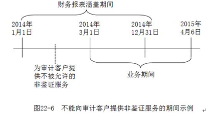 如圖22-6所示,如果會計(jì)師事務(wù)所在2014年1月1日至2014年3月1日期間為其審計(jì)客戶提供了不被允許的非鑒證服務(wù),將對獨(dú)立性產(chǎn)生不利影響。