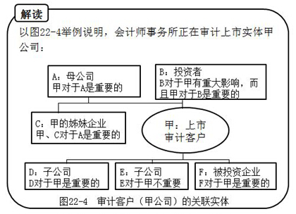 母公司是指直接或間接控制被審計單位的實體,且當被審計單位對其重要時,該母公司應當被包含在審計客戶的定義中,即圖22-4中的A公司。
