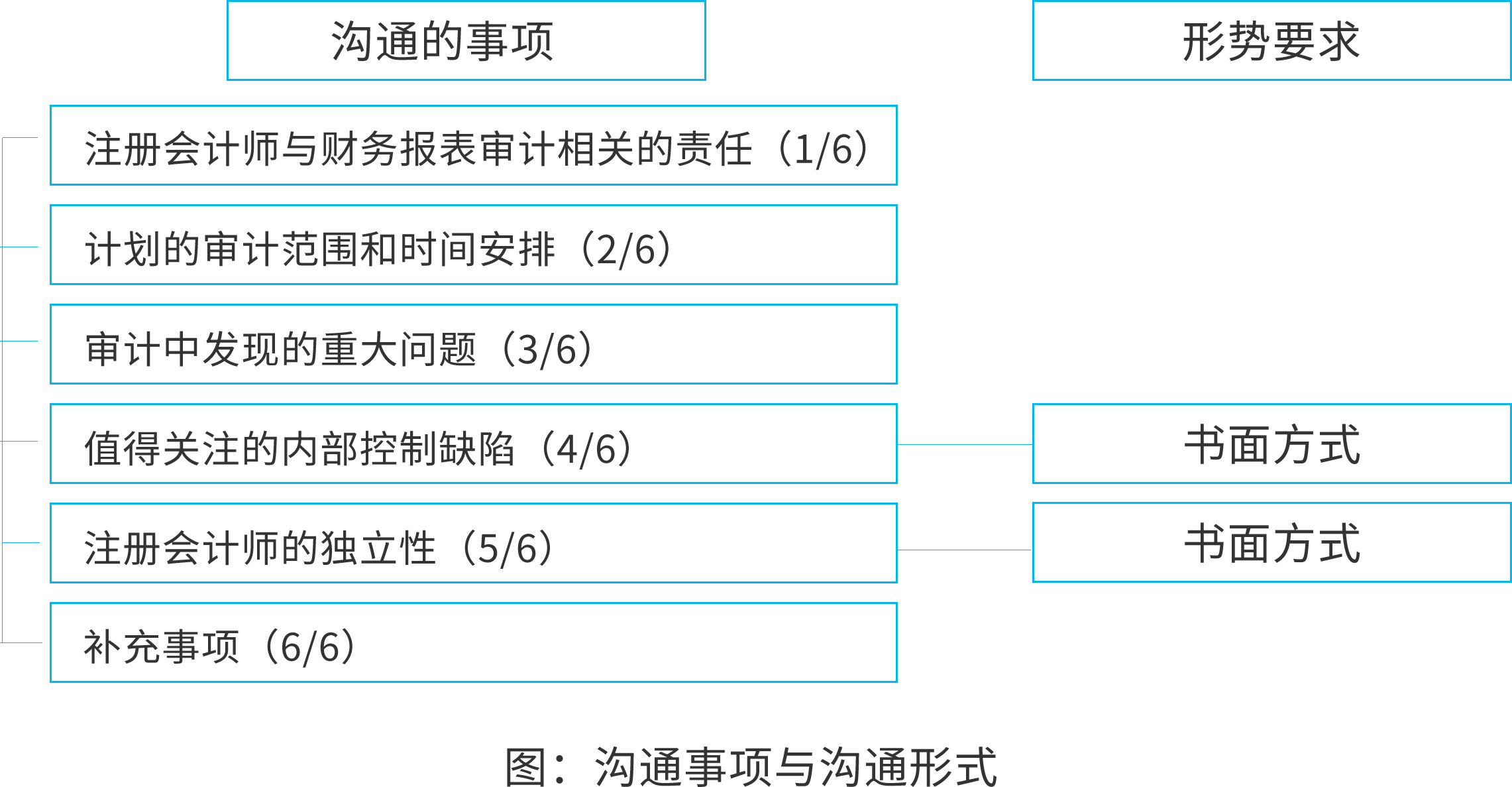 審計(jì)準(zhǔn)則明確規(guī)范了注冊會(huì)計(jì)師與治理層的溝通事項(xiàng)(六個(gè)方面)與溝通形式(書面或口頭),如圖所示。