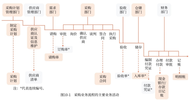 教材在本章中以一般制造業(yè)企業(yè)為例說明采購(gòu)業(yè)務(wù)流程,如圖10-1所示。