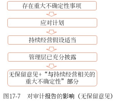 (2)說明這些事項或情況表明存在可能導致對被審計單位持續(xù)經(jīng)營能力產(chǎn)生重大疑慮的重大不確定性,并說明該事項并不影響發(fā)表的審計意見。如圖17-7所示。