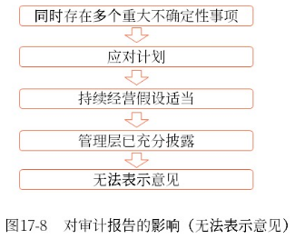 在極少數(shù)情況下,當存在多項對財務報表整體具有重要影響的重大不確定性時,注冊會計師可能認為發(fā)表無法表示意見而非增加以“與持續(xù)經(jīng)營相關的重大不確定性”為標題的單獨部分是適當?shù)模鐖D17-8所示。