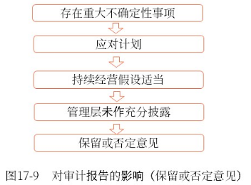 如果持續(xù)經(jīng)營假設適當,但存在重大不確定性,且財務報表未作出充分披露,注冊會計師應當發(fā)表保留意見或否定意見。注冊會計師應當在審計報告中說明,存在可能導致對被審計單位持續(xù)經(jīng)營能力產(chǎn)生重大疑慮的重大不確定性。如圖17-9所示。