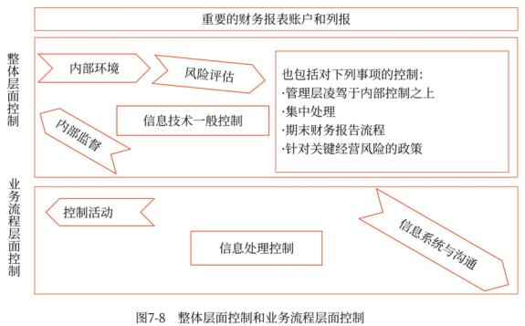內(nèi)部控制的某些要素(如內(nèi)部環(huán)境)更多地對被審計單位整體層面產(chǎn)生影響,而其他要素(如信息系統(tǒng)與溝通、控制活動)則可能更多地與特定業(yè)務(wù)流程相關(guān),如圖7-8所示。