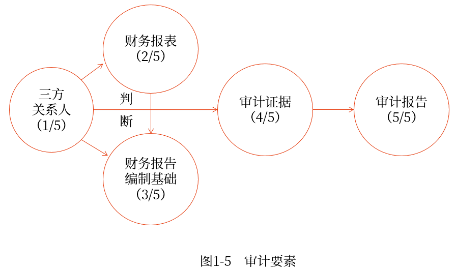 在財務(wù)報表審計中,審計要素包括審計業(yè)務(wù)的三方關(guān)系人(1/5)、財務(wù)報表(2/5)、財務(wù)報告編制基礎(chǔ)(3/5)、審計證據(jù)(4/5)和審計報告(5/5)。