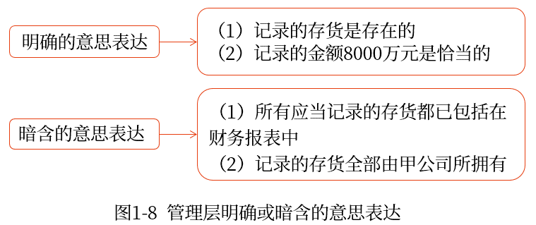 明確或暗含的意思表達的舉例。比如,甲公司2023年12月31日資產(chǎn)負債表中列示的存貨項目金額為8000萬元,則管理層明確或暗含的意思表達如圖1-8所示。