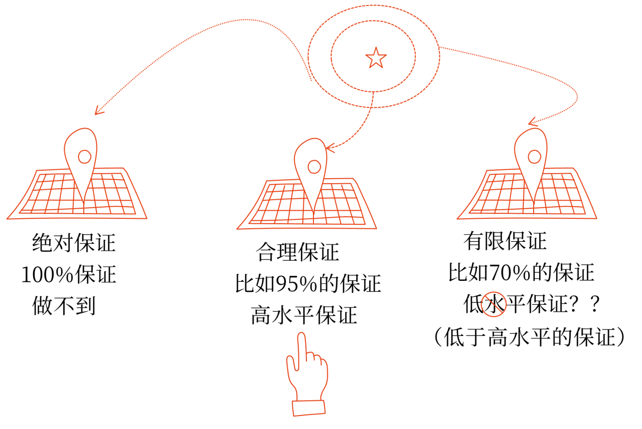 (3)保證程度 | 合理保證是一種高水平保證。 當(dāng)注冊會計師獲取充分、適當(dāng)?shù)膶徲嬜C據(jù)將審計風(fēng)險降至可接受的低水平時,就獲取了合理保證。 由于審計存在固有限制,注冊會計師得出審計結(jié)論和形成審計意見依據(jù)的大多數(shù)審計證據(jù)是說服性而非結(jié)論性的,因此審計只能提供合理保證,而不能提供絕對保證。 |
