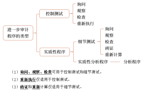 進一步審計程序的類型包括檢查、觀察、詢問、函證、重新計算、重新執(zhí)行和分析程序。