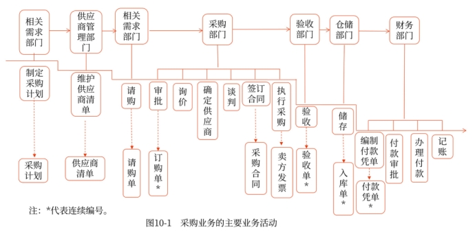 本章以一般制造業(yè)企業(yè)為例,說明采購業(yè)務(wù)的主要業(yè)務(wù)活動(dòng),如圖10-1所示。